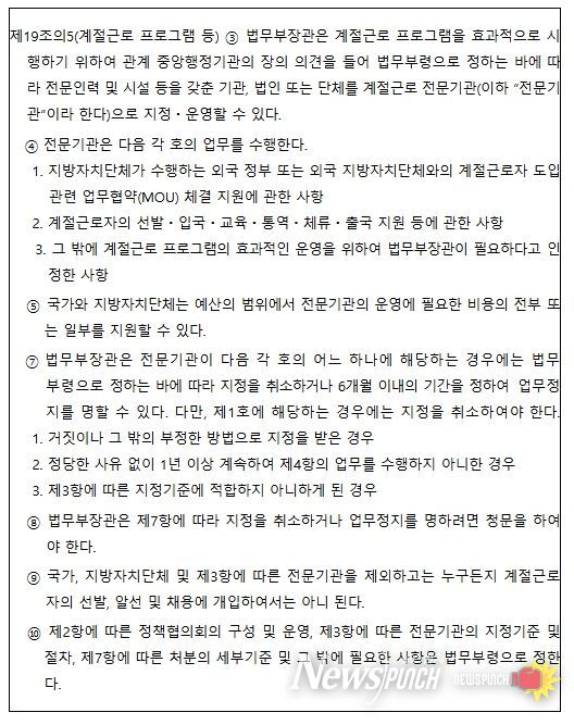 아울러 지방정부의 행정부담을 줄이고 도입 과정에서의 투명성을 높이기 위해 전문인력과 시설을 갖춘 기관, 법인 또는 단체를 '계절근로 전문기관'으로 지정·운영할 수 있는 근거도 마련됐다.