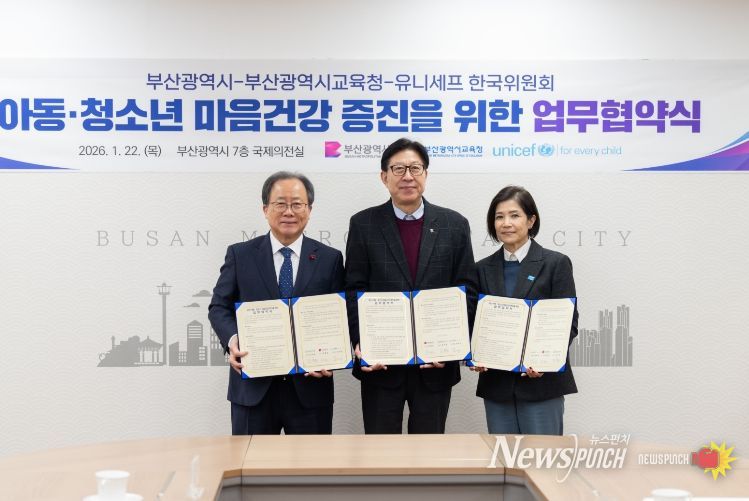 뉴스펀치 김윤걸 기자 | 부산광역시교육청은 지난 22일 오후 부산시청 7층 국제의전실에서 부산시, 유니세프 한국위원회(사무총장 조미진)와 함께 부산 지역 아동·청소년의 마음건강 증진을 위한 업무협약(MOU)을 체결했다.