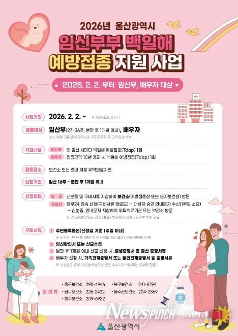 뉴스펀치 김윤걸 기자 | 울산 중구보건소가 오는 2월 2일부터 임산부와 배우자를 대상으로 백일해 무료 예방접종을 실시한다.