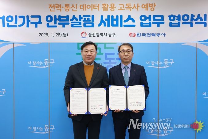 뉴스펀치 김윤걸 기자 | 울산 동구는 1월 26일 오후 3시 30분 ‘1인가구 안부살핌 서비스’ 사업 추진을 위해 한국전력공사와 업무 협약을 체결했다.