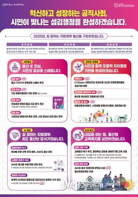울산시는 ‘인공지능(AI) 수도 울산’에 걸맞은 인재 양성과 미래세대 투자, 시민 중심의 공동체 조성을 위해 ▲울산 애(愛) 진심, 시민의 일상에 스며듦 ▲시민과 함께 포용적 자치행정 기반 완성 ▲일 잘하는 지방정부, 인공지능(AI)도 울산이 앞서감 ▲내일을 여는 힘, 울산형 교육복지 실현 등 4대 전략을 추진한다.