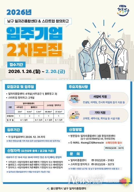 뉴스펀치 김윤걸 기자 | 울산 남구는 창업지원 공간의 효율적인 운영을 위해 기간 만료 등으로 공실이 발생한 ‘일자리종합센터’와 ‘스타트업 창의차고’사무공간과 물류창고에 대해 입주기업을 모집한다고 밝혔다.