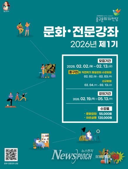 중구문화의전당 관계자는 “주민들의 삶의 질 향상을 위해 다양한 문화 예술 강좌를 지속적으로 발굴해 운영하겠다”며 “주민들의 많은 관심과 참여를 기다린다”고 밝혔다.