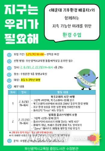 뉴스펀치 김윤걸 기자 | 부산광역시립중앙도서관은 다음달 8일과 22일 수정분관에서 초등학교 1~3학년 10명을 대상으로 환경 책 놀이 프로그램 ‘지구는 우리가 필요해’를 운영한다.