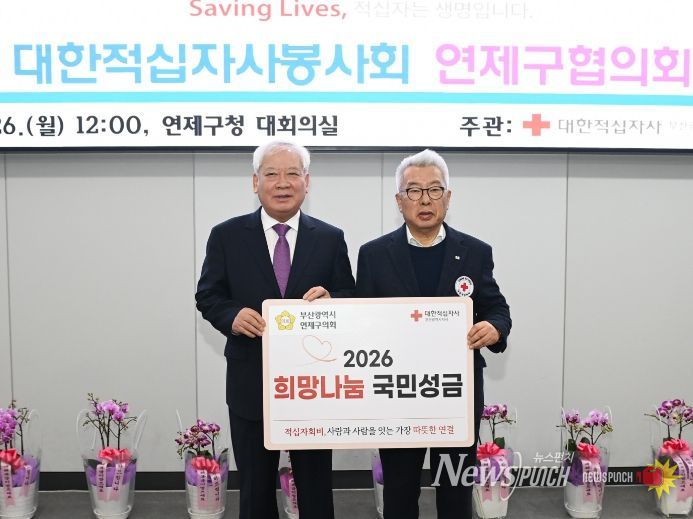 뉴스펀치 김윤걸 기자 | 부산광역시 연제구의회는 지난 1월 26일 2026년도 적십자 특별회비를 대한적십자사 부산지사 측에 전달했다. 이는 지역 내 취약계층에 온정을 나누고 나눔문화 확산에 기여하기 위한 것으로 연제구의회는 해마다 적십자 특별회비 납부에 적극 동참하고 있다. 권종헌 의장은 "우리의 작은 나눔이 어려운 분들에게 희망을 불어넣는 계기가 되길 바란다”며 “연제구의회도 이웃과 함께하는 따뜻한 지역사회를 만들어가기 위해 최선을 다하겠다”고 말했다.