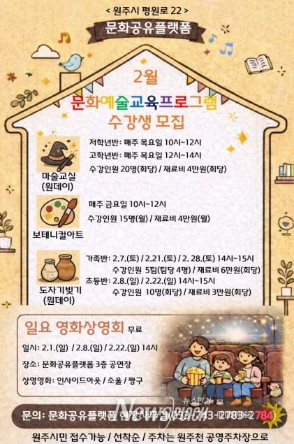 원주시 관계자는 “문화공유플랫폼 운영 활성화를 위해 앞으로도 다양한 프로그램을 지속적으로 마련하겠다”라고 말했다.
