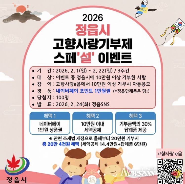 시 관계자는 “고향사랑기부제는 정읍과 기부자를 잇는 소중한 나눔의 통로”라며 “설맞이 특별 이벤트를 통해 많은 분이 고향을 향한 그리운 마음을 표현하고 기부에도 함께해주시길 바란다”라고 전했다.