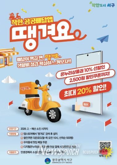 뉴스펀치 김용희 기자 | 광주광역시 서구가 골목경제 활성화를 위해 공공배달앱 할인쿠폰 지원사업을 본격 시행한다. 서구는 오는 2월부터 공공배달앱 ‘땡겨요’ 이용 시 사용할 수 있는 2500원 할인쿠폰을 하루 500매씩 발행한다고 밝혔다.