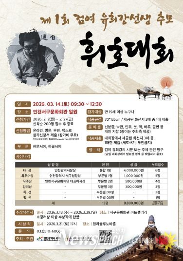 뉴스펀치 정홍균 기자 | 인천서구문화재단은 오는 2월 2일부터 2월 27일까지 ‘제1회 검여 유희강 선생 추모 휘호대회’ 참가자를 모집한다.