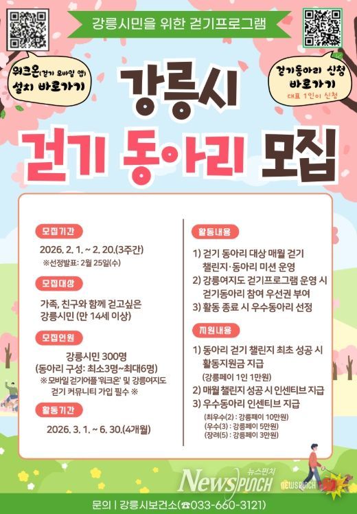 뉴스펀치 조평훈 기자 | 강릉시보건소는 시민들의 건강 걷기 참여를 확대하고 걷기 생활화를 정착시키기 위해 ‘2026 행복 가득, 건강 가득’ 강릉시 걷기 동아리 참가자를 오는 2월 1일부터 2월 20일까지 모집한다.