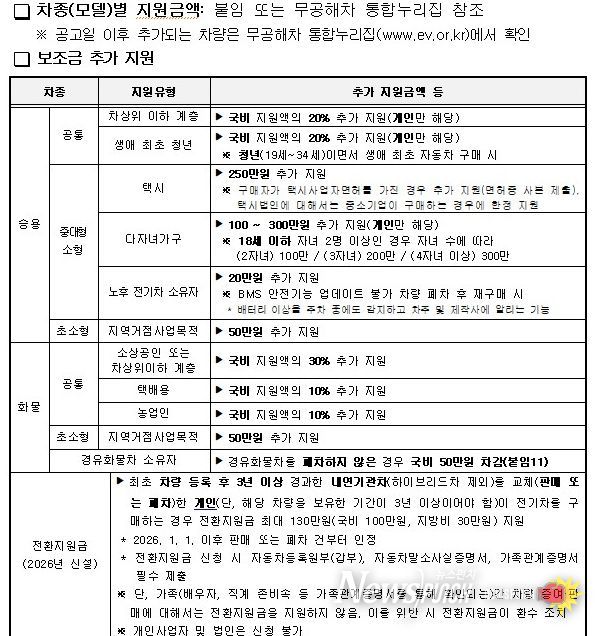 차종별 보조금 지원 금액과 추가 지원 대상 조건 등은 무공해차 통합누리집에 게시된 공고문을 통해 확인할 수 있다.