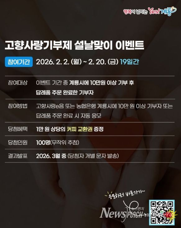 시 관계자는 “설 명절을 맞아 고향을 응원하는 마음을 기부로 표현할 수 있도록 이번 이벤트를 마련했다”며 “더 많은 분들이 고향사랑기부제에 참여해 계룡시 발전에 힘을 보태주길 기대한다”고 말했다.