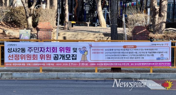 뉴스펀치 박상훈 기자 | 고양특례시 덕양구 성사2동은 지역사회 발전과 주민 복지 증진을 위해 함께 봉사할 주민자치회 위원을 공개 모집한다고 밝혔다.
