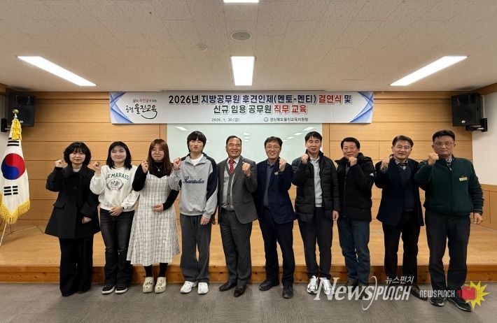 뉴스펀치 박세훈 기자 | 경상북도울진교육지원청은 1월 30일 울진교육지원청 3층 영재교육원에서 2026년 지방공무원 후견인제(멘토-멘티) 결연식 및 신규 임용자에 대한 직무교육을 실시했다.