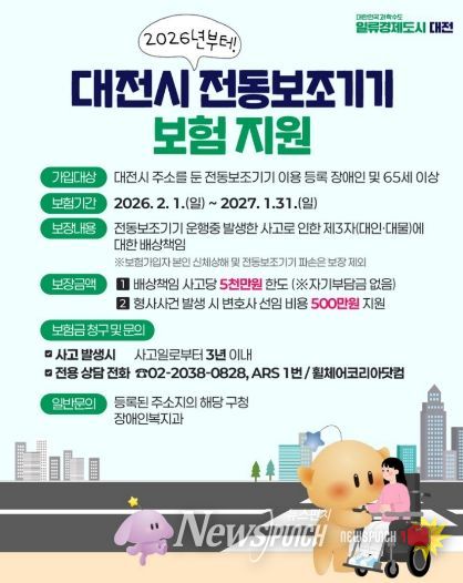 뉴스펀치 이현승 기자 | 대전시는 전동휠체어 및 전동스쿠터 이용 장애인의 안전하고 자유로운 이동을 위해, 2026년 2월 1일부터‘전국 최고 수준'의 전동보조기기 보험을 전면 시행하고, 5개 자치구 통합형 제도로 운영해 사고 배상부터 법적 분쟁 지원까지 폭넓은 안전망을 구축할 방침이다.