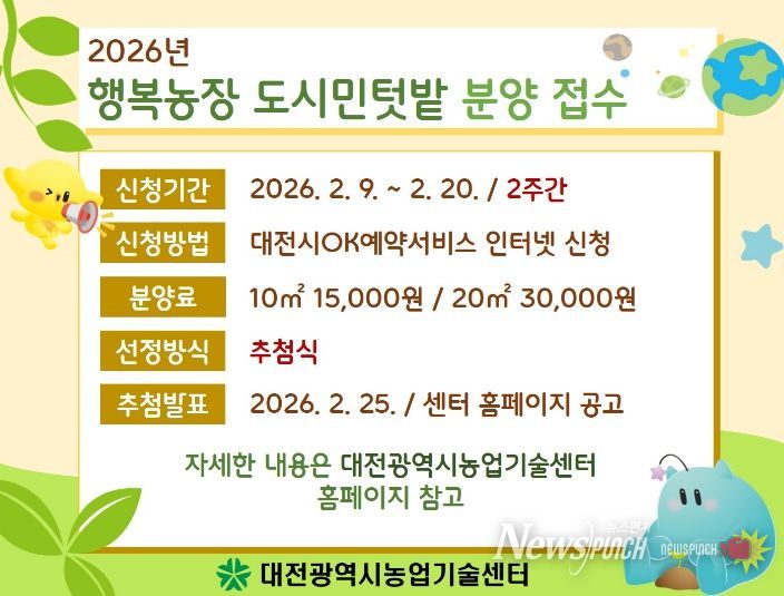 뉴스펀치 이현승 기자 | 대전시농업기술센터는 도심속 농업․농촌 체험을 통한 도시농업 확산을 위해 2월 9일부터 대전시민을 대상으로 행복농장(도시민텃밭) 참가자 110세대를 모집한다.
