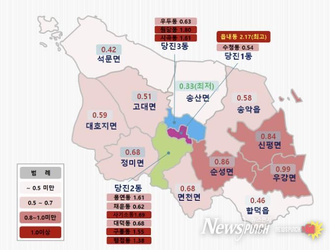 지역별로는 읍내동이 2.17%로 가장 높은 상승률을 기록했으며, 송산면은 0.33%로 가장 낮은 상승률을 보였다. 도심 지역과 상대적으로 개발 여건이 있는 지역은 상승 폭이 컸던 반면, 농촌 지역은 전년과 유사한 수준의 완만한 변동을 나타냈다.