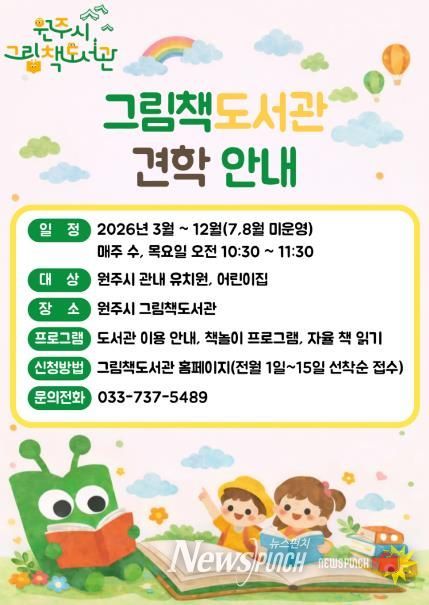 뉴스펀치 조평훈 기자 | 원주시 그림책도서관은 오는 3월부터 12월까지 관내 유치원과 어린이집을 대상으로 어린이 견학 프로그램을 운영한다.