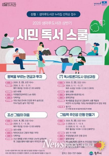 뉴스펀치 조평훈 기자 | 원주시 샘마루도서관은 시민들의 독서문화 향유 기회를 확대하기 위해 오는 3월부터 6월까지 ‘상반기 시민 독서 스쿨’ 프로그램을 운영한다.