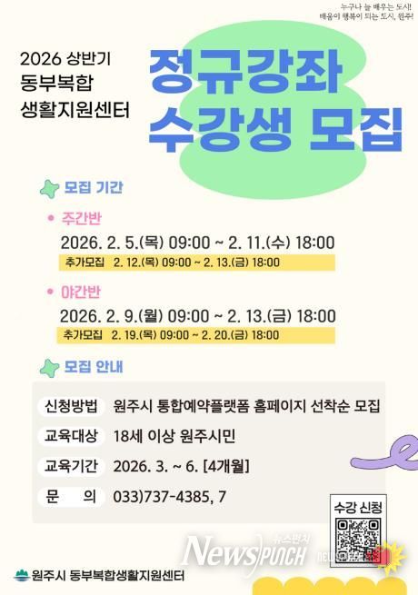 뉴스펀치 조평훈 기자 | 원주시 동부복합생활지원센터는 2026년 상반기 정규강좌 주·야간반 수강생을 모집한다.