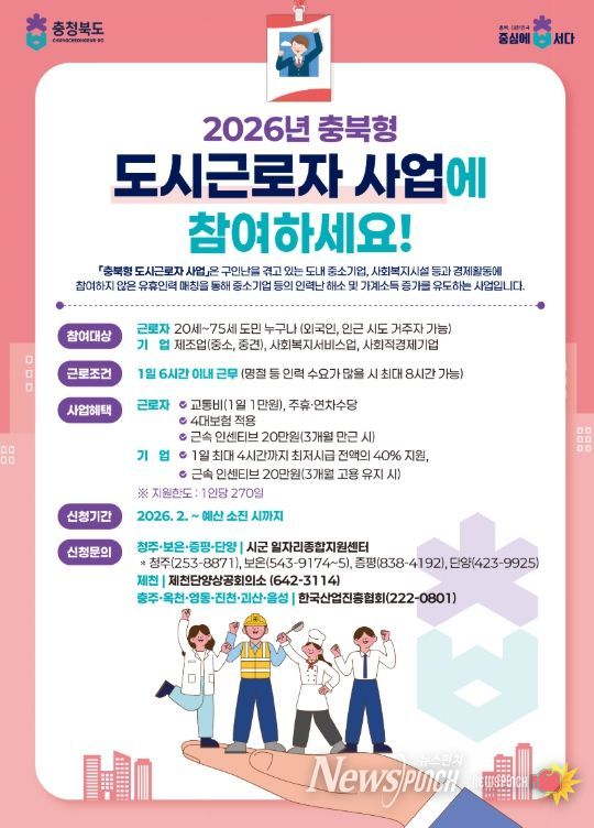 충북형 도시근로자 지원사업은 지역 생산 현장에 단시간(6시간 이내) 근로를 희망하는 유휴인력을 중소·중견기업에 연계하여 인력난을 해소하고 일자리를 창출하기 위해 추진하는 사업이다.