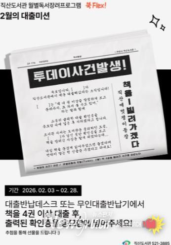 뉴스펀치 이현승 기자 | 천안시 직산도서관은 2월 ‘북 플렉스(Flex)’ 프로그램으로 ‘투데이 사건 발생!’을 운영한다고 2일 밝혔다.
