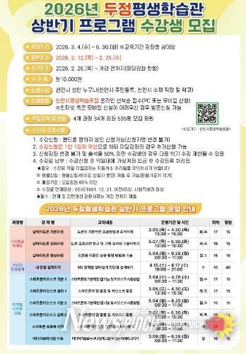 뉴스펀치 이현승 기자 | 천안시 두정평생학습관은 오는 12일부터 ‘2026년 상반기 평생학습 프로그램’ 수강생 535명을 선착순 모집한다고 2일 밝혔다.