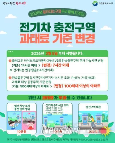 뉴스펀치 이현승 기자 | 대전 서구는 전기차 충전 질서 확립과 충전 시설 이용 효율 제고를 위해, 이달 5일부터 전기차 충전 구역 과태료 부과 기준을 변경 시행한다.
