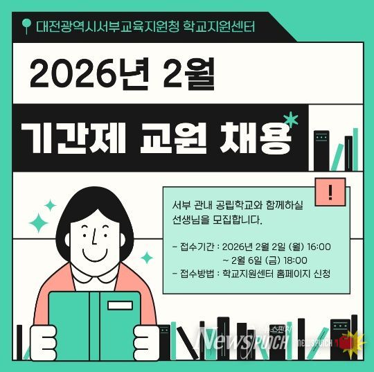 뉴스펀치 이현승 기자 | 대전서부교육지원청 학교지원센터는 학교 현장의 교원 공백 해소와 행정 부담 완화를 위해 ‘2026년도 제1차 관내 공립학교 기간제 교원 공개 채용’을 실시한다고 밝혔다.