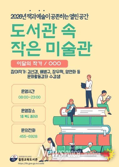 뉴스펀치 조평훈 기자 | 철원교육도서관(관장 김민서)은 2026년 2월부터 12월까지 도서관 공간을 활용한 전시 운영을 통해 이용자의 문화예술 접근성을 높이고, 일상 속에서 자연스럽게 문화예술을 향유할 수 있는 환경을 조성하고자 ‘도서관 속 작은 미술관’ 전시를 운영한다.