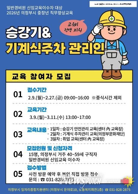참여 대상자는 2월 9일부터 27일까지 사전 방문 예약 후, 의정부시 일자리종합지원센터에 직접 방문해 신청하면 된다. 신청 시 신분증과 일반경비원 신임교육 이수증 사본을 지참해야 하며, 교육비는 전액 지원된다.