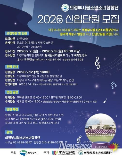 뉴스펀치 박상훈 기자 | 의정부시는 음악에 관심 있는 아동·청소년을 대상으로 시립소년소녀합창단 신입단원을 2월 2일부터 9일까지 모집한다고 밝혔다.