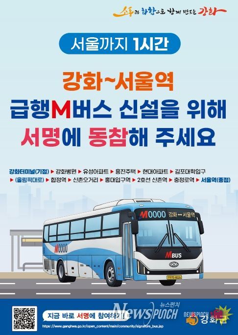 뉴스펀치 정홍균 기자 | 강화군은 ‘강화~서울역 M버스(광역급행버스)’ 노선 신설 유치를 위해 대규모 범군민 서명운동을 전개하며, 대대적인 행정력 집중에 나선다.