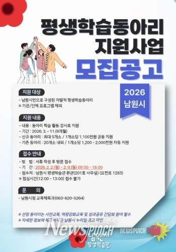 뉴스펀치 정홍균 기자 | 남원시가 시민의 자발적인 학습 문화를 형성하고, 지속 가능한 평생학습 문화를 조성하기 위해 2026년 평생학습동아리를 모집한다.
