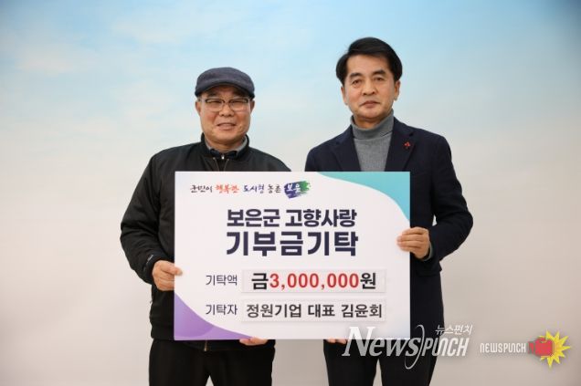 경기도 김포시에서 맨홀 안전 사다리 생산업체 ‘정원기업’을 운영 중인 김윤회 대표는 2일 보은군청을 방문해 고향사랑기부금 300만 원을 기탁했다.