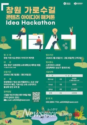 뉴스펀치 박세훈 기자 | 창원특례시는 ‘청년 365 핫플레이스 조성 사업’의 일환으로 2026년 2월 25일부터 26일까지 이틀간 스펀지파크 교육장(창원시 성산구 용호로 96)에서 '창원 가로수길 콘텐츠 아이디어 해커톤' 을 개최한다고 밝혔다.