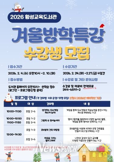 뉴스펀치 조평훈 기자 | 횡성교육도서관(관장 권정애)은 2월 4일부터 2월 10일까지 관내 초등학생을 대상으로 겨울방학 특강 수강생을 모집한다.