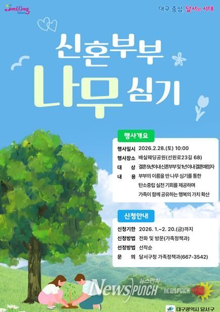 뉴스펀치 조평훈 기자 | 대구 달서구는 결혼의 의미를 되새기고 신혼부부의 새로운 출발을 지역사회가 함께 응원하기 위해, 신혼부부가 직접 나무를 심으며 미래를 약속하는 '행복한 신혼부부 나무심기' 행사를 2월 28일, 배실웨딩공원에서 개최한다.