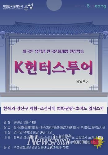 뉴스펀치 조평훈 기자 | 대구 수성문화재단은 올해 2월부터 11월까지 대구·경북 외국인 유학생을 대상으로 한국문화체험 현장학습 ‘K헌터스 투어’를 운영한다.