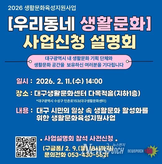 뉴스펀치 조평훈 기자 | 대구문화예술진흥원은 2월 13일부터 3월 6일까지 2026 생활문화육성지원사업 '우리동네 생활문화'에 참여할 생활문화 공간 및 연계 기획단체를 공개 모집한다.