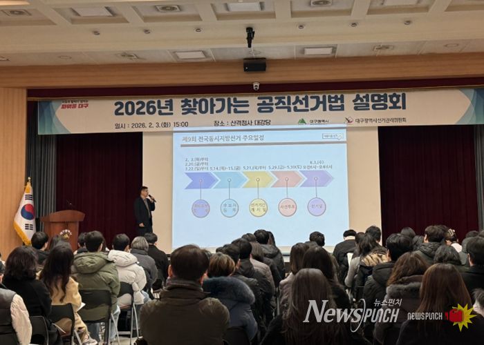 뉴스펀치 조평훈 기자 | 대구광역시는 6월 3일 실시되는 ‘제9회 전국동시지방선거’를 앞두고 공무원의 정치적 중립을 다짐하고 공직선거법 이해도를 높이기 위해, 2월 3일 시청 산격청사에서 ‘찾아가는 공직선거법 설명회’를 개최했다.