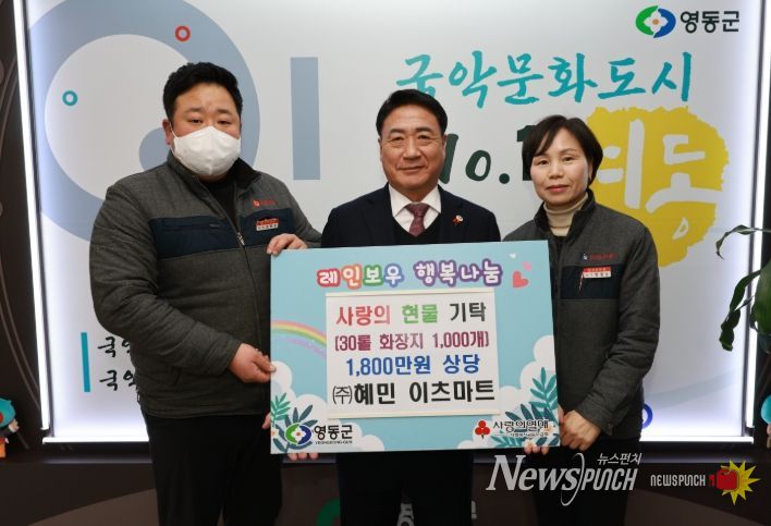 뉴스펀치 이현승 기자 | ㈜혜민 이츠마트(대표 정진흥)는 4일 영동군청을 방문해 지역 내 어려운 이웃을 돕기 위한 현물 기탁 30롤 화장지 1,000개(1,800만 원 상당)를 기탁했다.