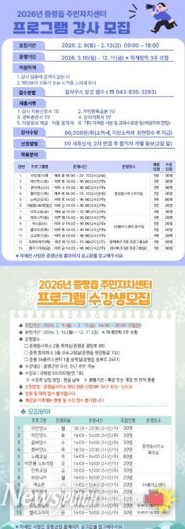 뉴스펀치 이현승 기자 | 충북 증평군 증평읍 주민자치센터가 오는 2월 9일부터 13일까지 5일간 2026년도 주민자치센터 프로그램 수강생과 강사를 모집한다.