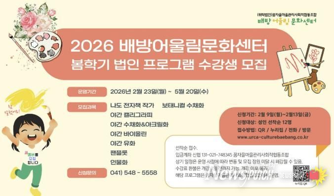 뉴스펀치 이현승 기자 | 아산시는 배방어울림문화센터는 2026년 봄학기 생활·문화·예술 교육 프로그램 수강생을 모집한다고 밝혔다.
