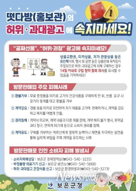뉴스펀치 이현승 기자 | 충북 보은군은 최근 방문판매업(홍보관) 운영과 관련해 노인을 중심으로 한 소비자 피해가 우려됨에 따라, 피해 예방을 위한 종합 대책을 마련하고 본격 추진에 나섰다고 4일 밝혔다.