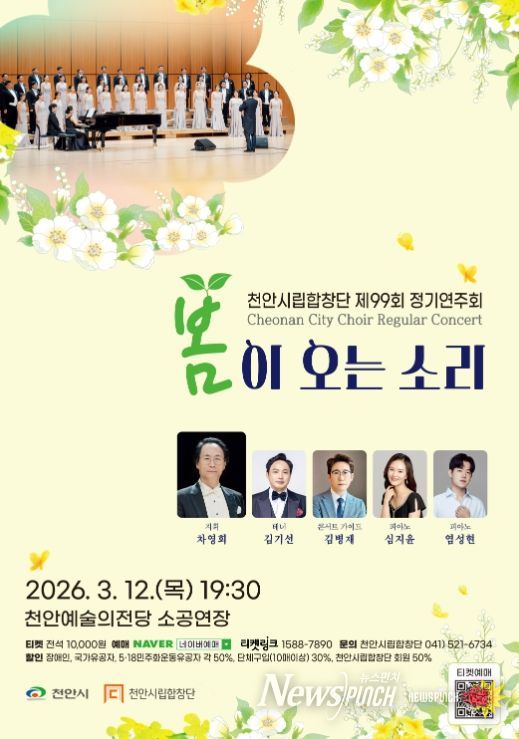 뉴스펀치 이현승 기자 | 천안시립합창단이 오는 3월 12일 천안예술의전당 소공연장에서 제99회 정기연주회 ‘봄이 오는 소리’를 개최한다.
