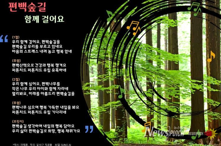 후렴구에는 ‘편백산책으로 건강과 행복 챙겨요’, ‘피톤치드 우릴 유혹하네’라는 메시지를 경쾌한 리듬에 담아, 편백숲이 주는 상쾌함과 치유의 가치를 자연스럽게 전달한다.