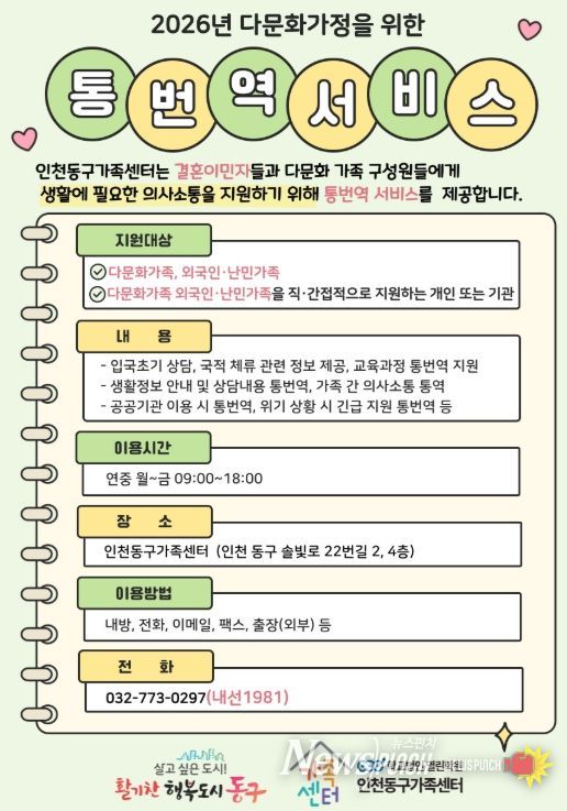 뉴스펀치 정홍균 기자 | 인천동구가족센터는 결혼이민자의 언어 장벽을 해소하고 안정적인 한국 사회 정착을 돕기 위해 ‘결혼이민자 통·번역 무료서비스’를 운영한다고 밝혔다.