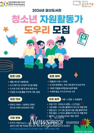 뉴스펀치 정홍균 기자 | 부평구립 갈산도서관은 오는 27일까지 청소년 자원활동가 ‘도우리’를 모집한다고 밝혔다.