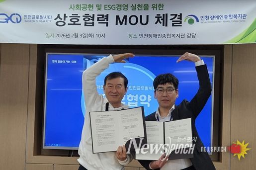 뉴스펀치 정홍균 기자 | 인천시사회서비스원 소속 인천시장애인종합복지관은 최근 ㈜인천글로벌시티와 손잡고 지역사회 장애인 복지 증진에 나선다고 4일 밝혔다.